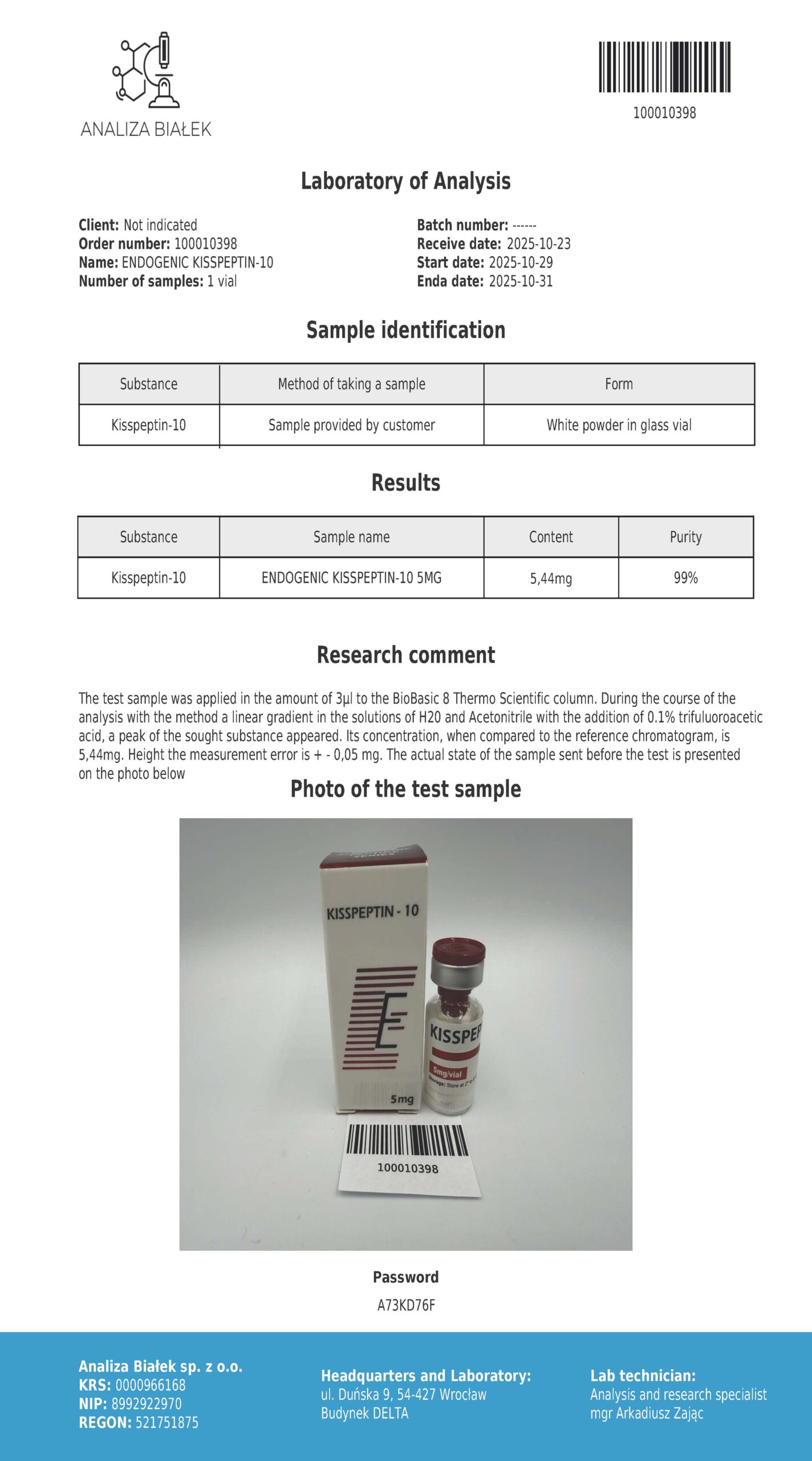 KISSPEPTIN-10 to neuropeptyd wytwarzany głównie przez komórki nerwowe podwzgórza, składający się z 10 aminokwasów. Ma on nieco krótszy okres półtrwania niż K-54, ale za to o wiele szybsze działanie. Jest produktem genu KISS-1, który koduje kilka podobnych peptydów posiadających charakterystyczny C-końcowy motyw. W suplementacji sportowej Kisspeptin-10 stosowany jest głównie jako element PCT. Substancja wraz z innymi dodatkami pozwala na lepszą stymulację hormonów lh i fsh. W konsekwencji, osoby dążące do odblokowania się po cyklu robią to efektywniej, przywracając prawidłowy poziom testosteronu.